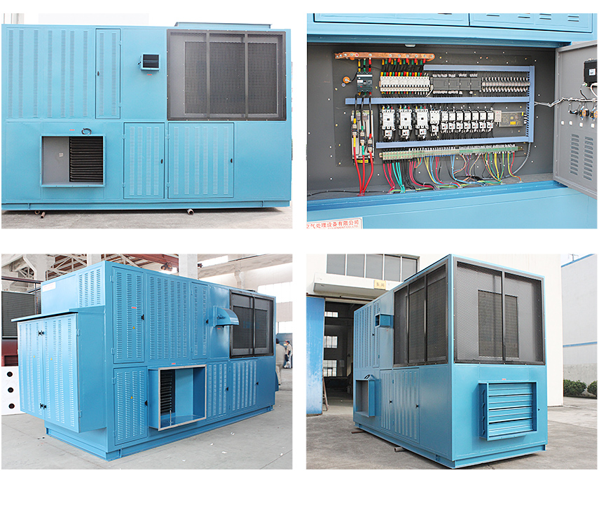 在噴涂車間的生產(chǎn)工藝中,有著嚴格的溫濕度要求,一般的要求為溫度 T ≤ 28 -30 ℃ ,相對濕度RH ≤ 40-50% 。同時由于這些場合又為高大廠房,且車間回風含有油漆等有害揮發(fā)成份,不能回收,只能使用全新風系統(tǒng)。因為夏季及其他高溫多雨季節(jié)的空氣中含水量較大,待處理的鋼鐵表面會均勻分布著細少的水滴,會直接影響到油漆在鋼鐵表面的附著牢度,嚴重的甚至是油漆不能直接附著到鋼鐵的表面。同時,油漆噴涂后,干燥時間將大大延長,影響后續(xù)的生產(chǎn)工藝。特點:制冷+除濕+加熱,常用風量為:12000CMH、18000CMH、25000CMH。